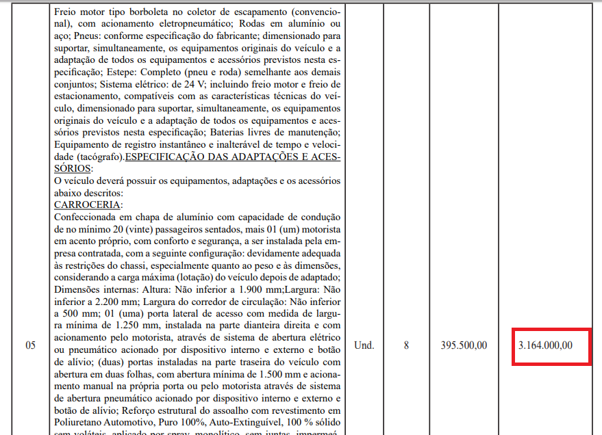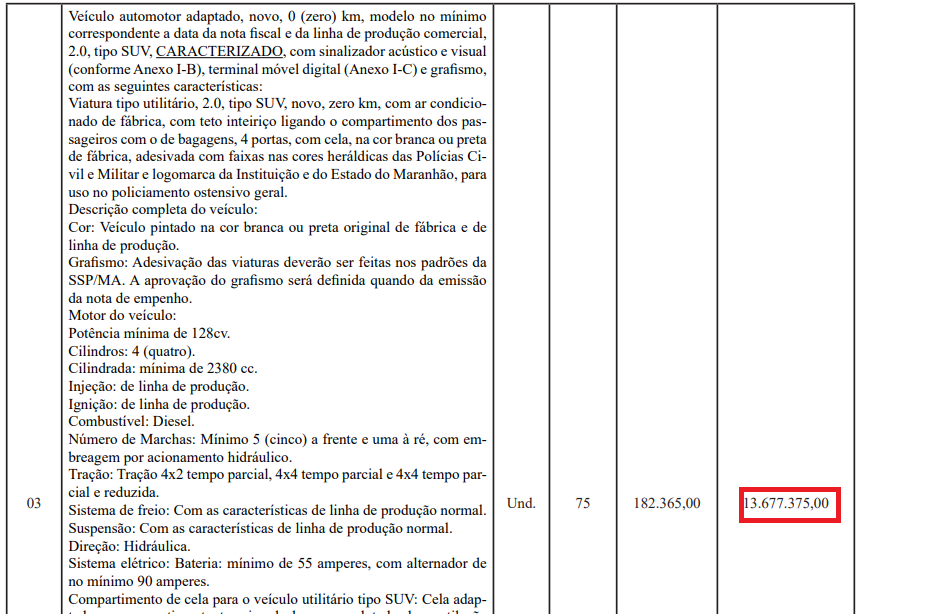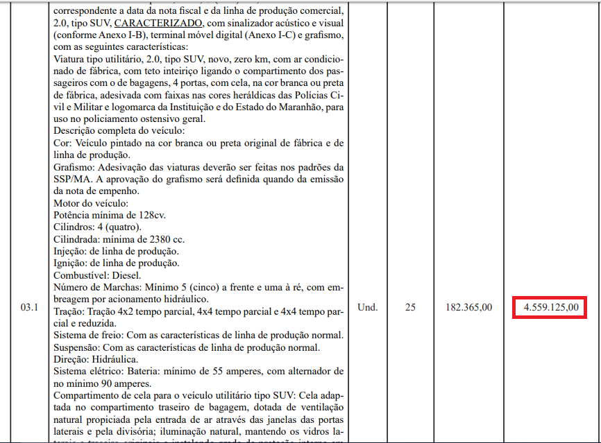 Serão 185 automóveis de luxo destinados aos Sistema de Segurança Pública, sendo 75 do modelo Ranger 2.2 XL MT, que irão custar R$ 14.318.625,00 milhões; 100 do modelo JEEP Compass Longitude 2.0, que vão custar R$ 18.236.500 milhões; e 10 do modelo Chassi Agrale 10.00 Carroceria que irão custar R$ 3.955.000,00 milhões.
