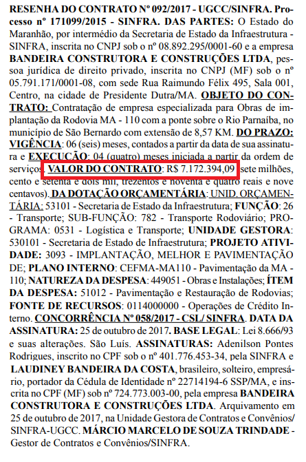 O valor da obra foi orçado em R$ 7.172.394,09 (sete milhões, cento e setenta e dois mil, trezentos e noventa e quatro reais e nove centavos) e divulgado no Diário Oficial do Maranhão.