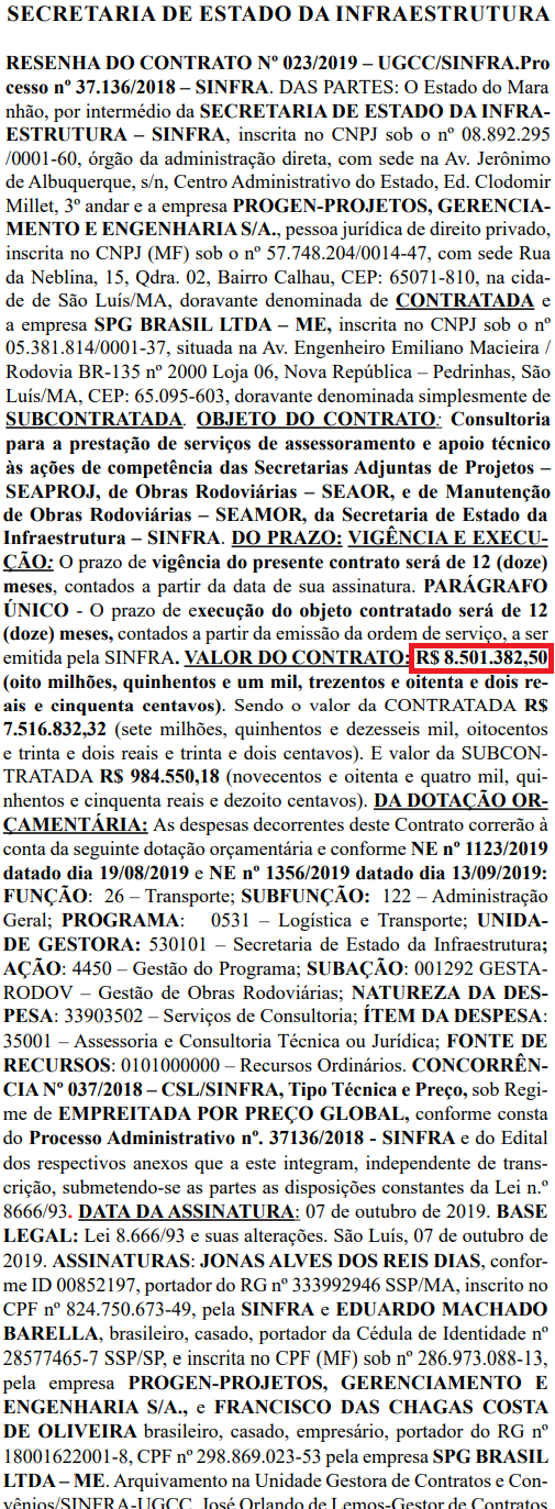 O valor total da prestação de serviço foi orçado em R$ 8.501.382,50 milhões, sendo que R$ 7.516.832,32 milhões ficará com a Progen e R$ 984.550,18 mil será destinado a empresa subcontrada, que tem como sócios Franscisco das Chagas de Oliveira e Kevin de Oliveira.
