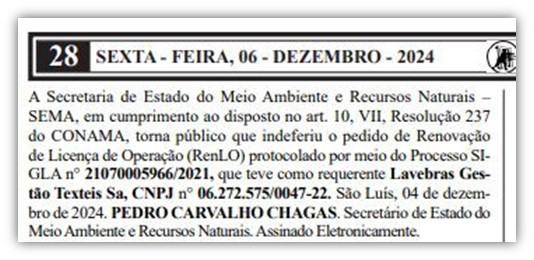 De acordo com o relato, no dia 6 de dezembro de 2024, a Secretaria de Estado do Meio Ambiente do Maranhão (SEMA-MA) cancelou a Licença de Operação Ambiental da Lavebrás, publicada no Diário Oficial do Estado.