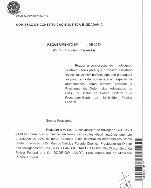 Diante das ofensas proferidas pelo advogado Gustavo Zanelli ao povo do norte e nordeste brasileiro, especialmente os maranhenses, o deputado federal Francisco Escórcio (PMDB-MA) protocolou requerimento na Comissão de Constituição, Justiça e Cidadania da Câmara dos Deputados solicitando a convocação do advogado para que o mesmo esclareça os insultos discriminatórios. O parlamentar também convidou o presidente da Ordem dos Advogados do Brasil, Dr. Leandro Daiello Coimbra, o diretor da Polícia Federal e o procurador-geral do Ministério Público Federal, Dr. Rodrigo Janot.