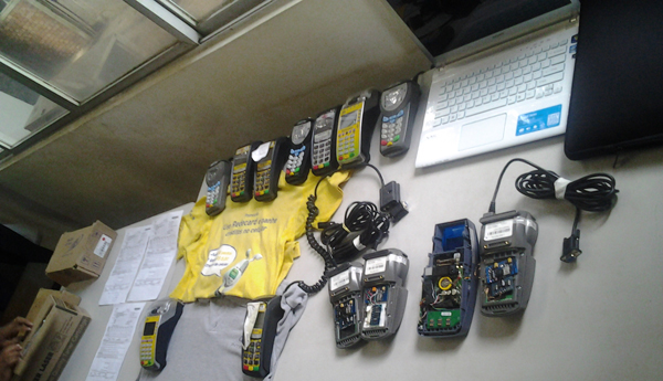 Em poder dos acusados foram apreendidas 13 máquinas leitoras de cartão pimpede, documentos falsos em nomes de empresas, notebooks, e celulares.