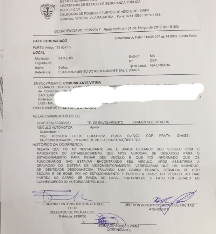 Foi o relato feito em Boletim de Ocorrência pelo empresário Eduardo Viana, que teve o veículo Toyota Hilux, placas xxxx, roubada dentro do próprio estacionando da churrascaria.