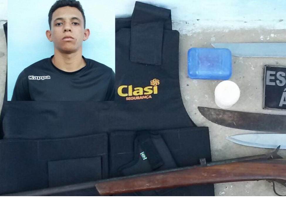 A Polícia Militar levou detido para o Plantão Marco Antônio De Sousa De Andrade, portando seis papelotes de uma substância semelhante a maconha, a quantia de R$ 10,00 (dez reais) e um celular Samsung com imagens do mesmo com uma capa de colete da empresa Clasi Segurança.