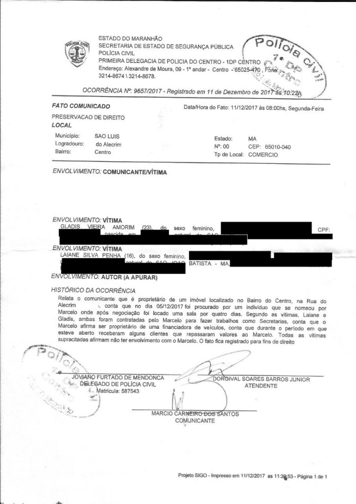 De acordo o Boletim de Ocorrência, na terça-feira (5), Marcelo alugou uma sala mobiliada, localizada na Rua do Alecrim, no Centro de São Luís, afirmando que estava implantando uma empresa financeira na cidade. Desse modo, contratou Gladis Vieira Amorim e Laiane Silva Penha como secretárias. A partir disso, Marcelo começou a vender financiamento de carro.