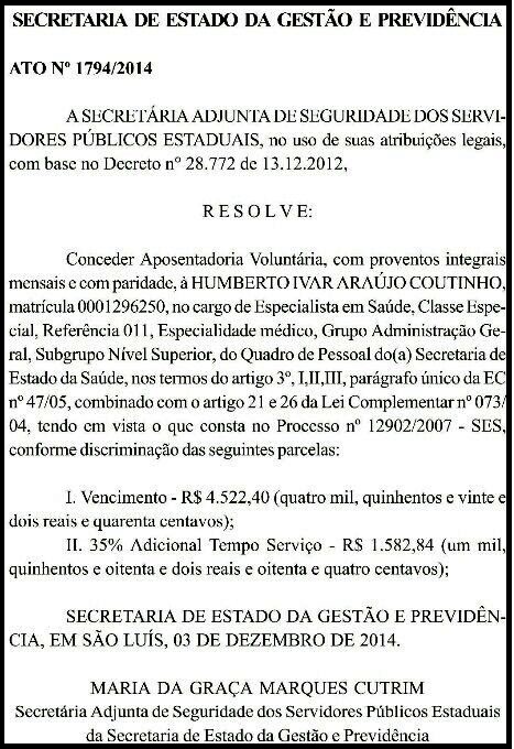 O governador temporário, Arnaldo Melo (PMDB), concedeu aposentadoria ao deputado eleito Humberto Coutinho (PDT). Ele integra ao quadro se funcionários da Saúde.