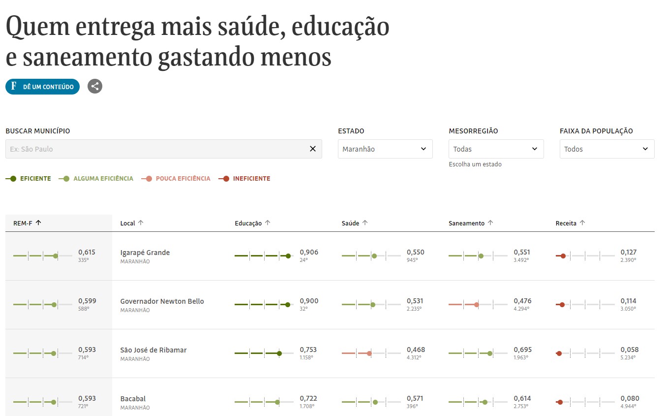 Os dados foram divulgados pelo site Folha de São Paulo e o município aparece como o mais eficiente do Estado. No cenário nacional, ele ocupa a 333ª posição no ranking, que avaliou um total de 5.570 municípios em todo o país.