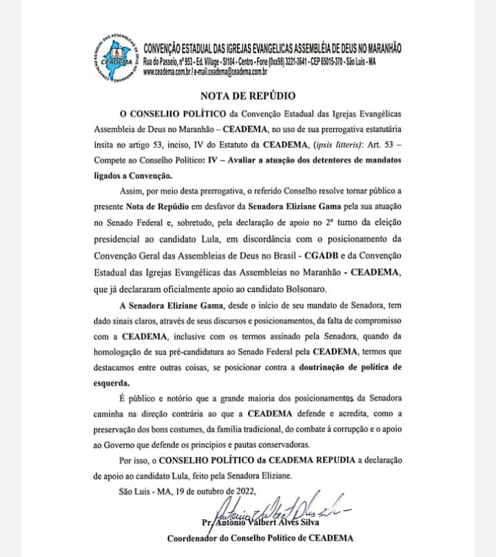 A Convenção Estadual das Igrejas Evangélicas Assembleia de Deus no Maranhão (CEADEMA) emitiu nota de repúdio contra senadora Eliziane Gama (Cidadania), que declarou apoio ao candidato a presidência, Luís Inácio Lula da Silva (PT), nesta quarta-feira (19), em São Paulo (reveja aqui).