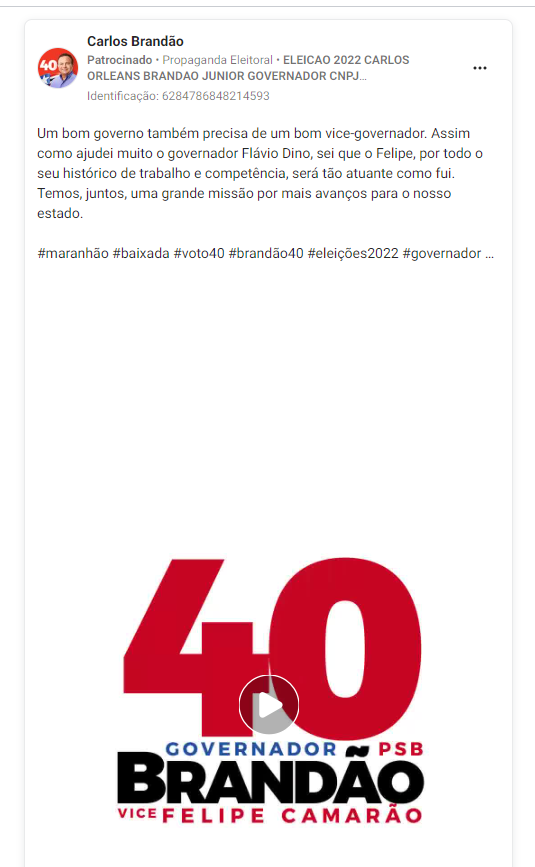 Para tentar se popularizar entre os maranhenses, o governador do Maranhão e candidato à reeleição, Carlos Brandão (PSB), já pagou R$ 140 mil em publicidades na empresa Meta, dona do Facebook e Instagram, no últimos 30 dias. Os dados são da própria plataforma, que disponibiliza um ranking com os dados.