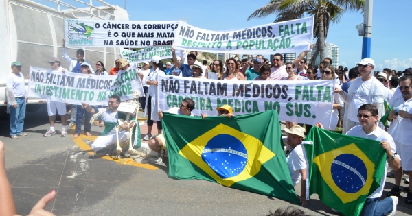 Durante o protesto, os manifestantes seguravam diversas faixas em que se lia: “Não faltam médicos, faltam condições de trabalho e carreira digna”; “Para atender brasileiros, só revalidando diploma” e “Presidente Dilma, o Brasil não precisa de mais médicos, precisa de um Ministério da Saúde competente”, entre outras. A caminhada dos médicos e estudantes de medicina tem como ponto de partida e chegada a Praça do Pescador, percorrendo boa parte da Avenida Litorânea na região da Praia de São Marcos.