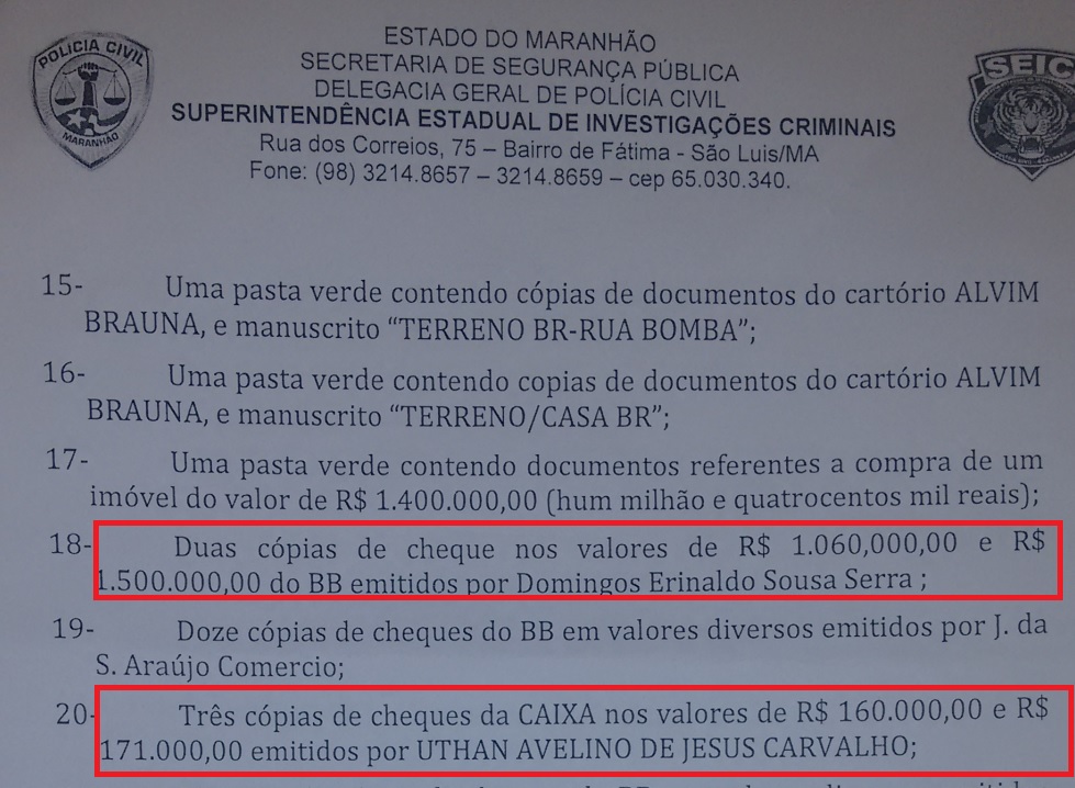 Confira na integra documento confirmando que houve apreensões de dois cheques do parlamentar.