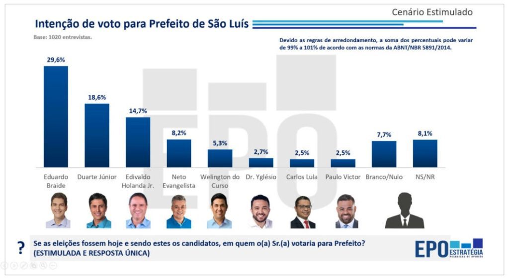 De acordo com a sondagem, o prefeito Eduardo Braide (PSD) lidera a disputa com 29,6% das intenções de votos, e em seguida vem deputado federal Duarte Júnior (PSB), com 18,6% e depois surge ex-prefeito Edivaldo Holanda Junior (sem partido), com 14,7%..