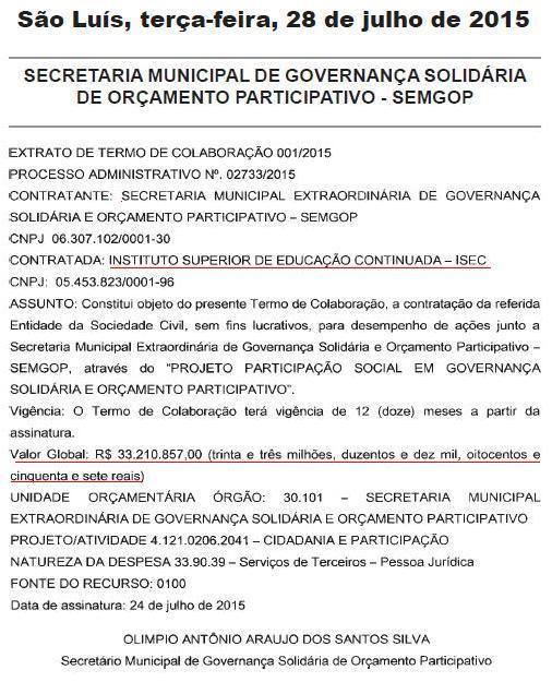 O contrato foi firmado com a Secretaria Municipal Extraordinária de Governança Solidária e Orçamento Participativo (SEMGOP). Na prática, o Instituto Superior de Edycação Continuada (Isec) foi ‘selecionado’ para o fornecimento de mão-de-obra para terceirização de serviços administrativos da Prefeitura.