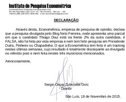 A empresa Econométrica divulgou declaração afirmando ser falsa a pesquisa divulgada pelo blog na qual apresenta parcial de 2% em favor de Thiago Diaz, candidato a presidente da OAB-MA. Diaz enfrenta a candidata da situação Valéria Lauande da Chapa Avança Mais e Mais.