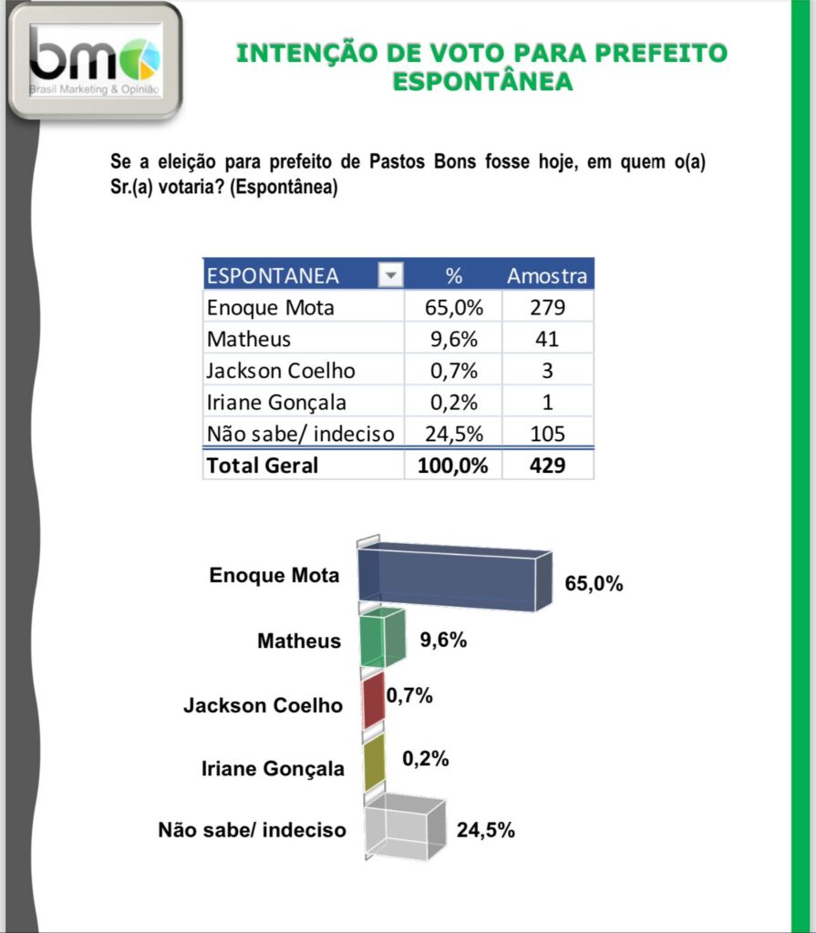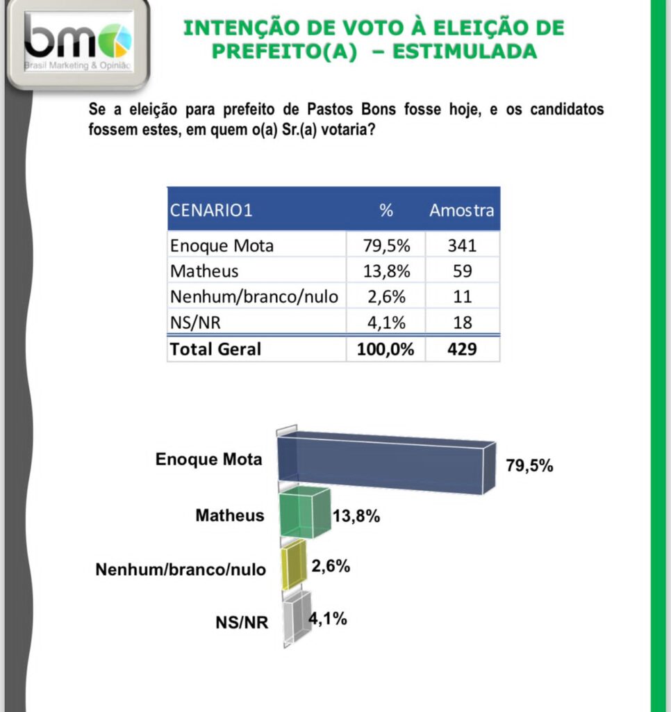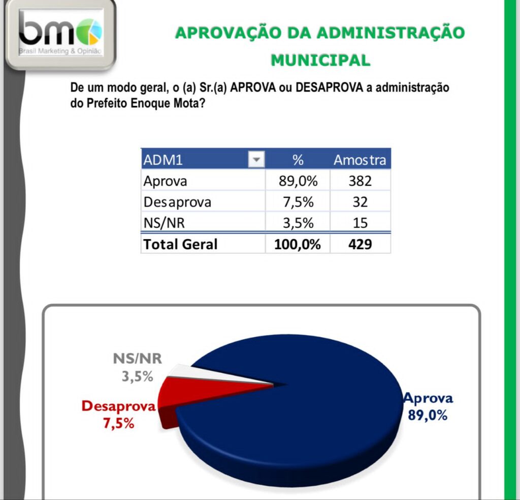 O dado ajuda a entender, ainda, a aprovação da atual gestão. Segundo o BMO, 89% dos eleitores de Pastos Bons aprovam a administração Enoque Mota.