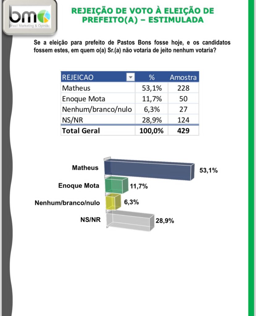 No quesito rejeição, a situação se inverte, com o pré-candidato Matheus Mota liderando. Nesse caso, 53,1% dos entrevistados disseram não votar nele de jeito nenhum.