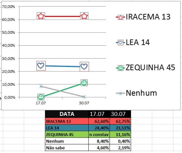 Iracema Vale não registrou variação significativa e continua liderando as pesquisas com ampla margem, em 17 de junho a candidata do PT tinha 62,6% e passou a 62,75% em 30 de julho.