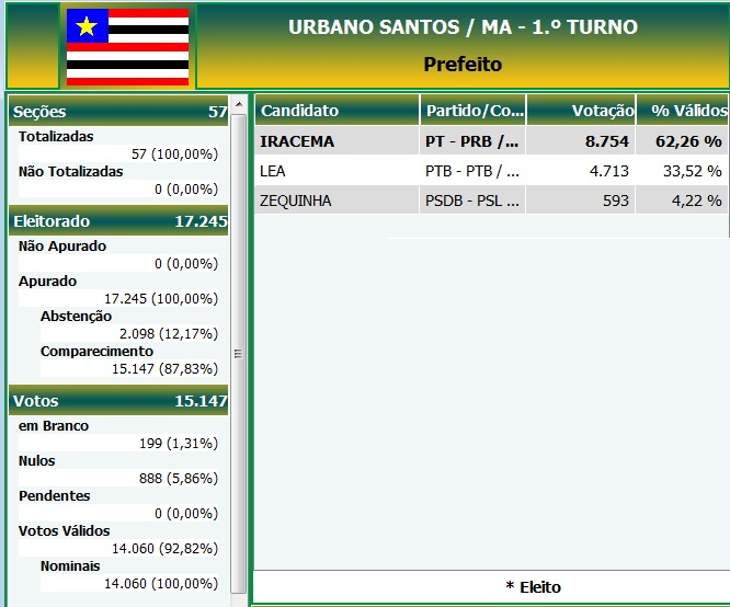 Iracema vence com folga em Urbano Santos; veja os números 07/10/2012 | PÁGINA PRINCIPAL, Notícias Navegação de Post Veja os 21 vereadores eleitos em ImperatrizVeja a lista dos vereadores eleitos em São Luís
