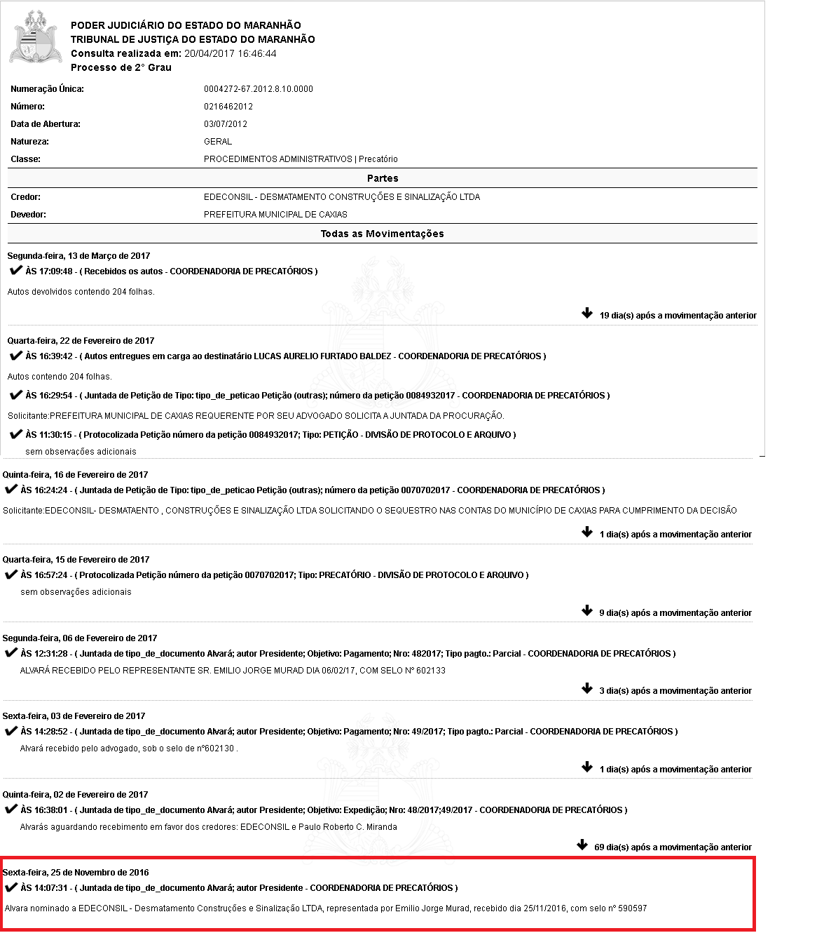 A empreiteira Edeconsil- Desmatamento Construções Ltda, cobra uma dívida da Prefeitura de Caxias que já virou precatório de nº 021646/2012, e o valor que deve ser pago é R$ 1.873.072,44 milhões.