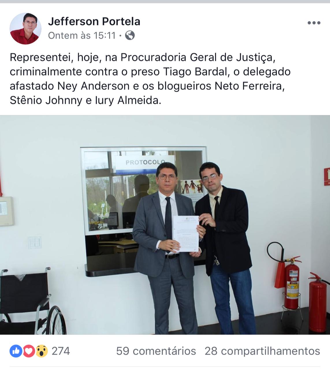 O Blog do Neto Ferreira foi representado criminalmente pelo secretário de Segurança Pública, Jefferson Portela, após divulgar uma série de denúncias feitas por Tiago Bardal e Ney Anderson Gaspar, ambos ex-delegado e delegado da Polícia Civil, nas quais acusam o chefe da SSP de mandar investigar, monitorar desembargadores e espionar familiares de magistrados.