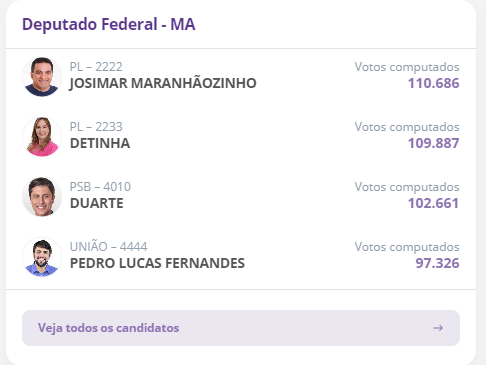Josimar e Detinha seguem para serem eleitos para Câmara Federal 02/10/2022 | PÁGINA PRINCIPAL, Notícias Navegação de Post Brandão segue na liderança da corrida do MaranhãoFlávio Dino é eleito senador pelo Maranhão