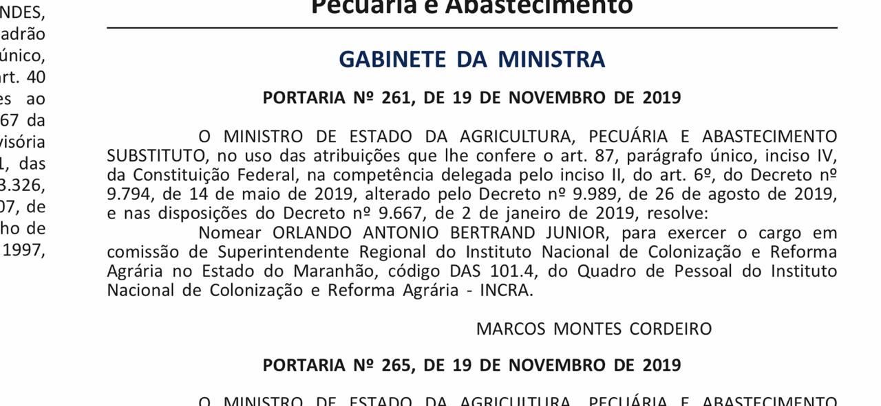 Após indicação do parlamentar, Orlando Antônio Beltrand Júnior foi nomeado para o órgão. A Portaria da nomeação foi publicada no Diário Oficial da União no último dia 19 pelo Ministério da Agricultura.