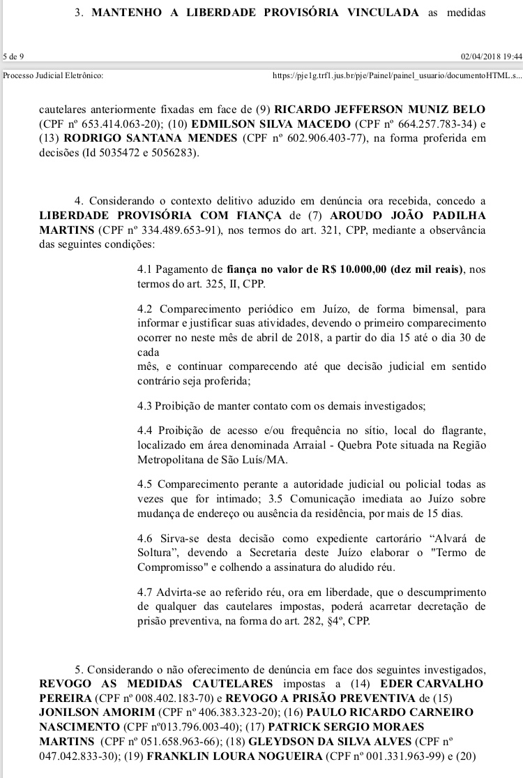A decisão foi proferida nesta segunda-feira (02). Com a decisão, ganham liberdade Aroud João Padilha Martins (pagamento de R$ 10 mil em fiança), Éder Carvalho Pereira, Jonilson Amorim, Paulo Ricardo Carneiro Nascimento, Patrick Sergio Moraes Martins, Gleydson da Silva Alves, Franklin Loura Nogueira e Antônio Erivelton Nunes Araújo.