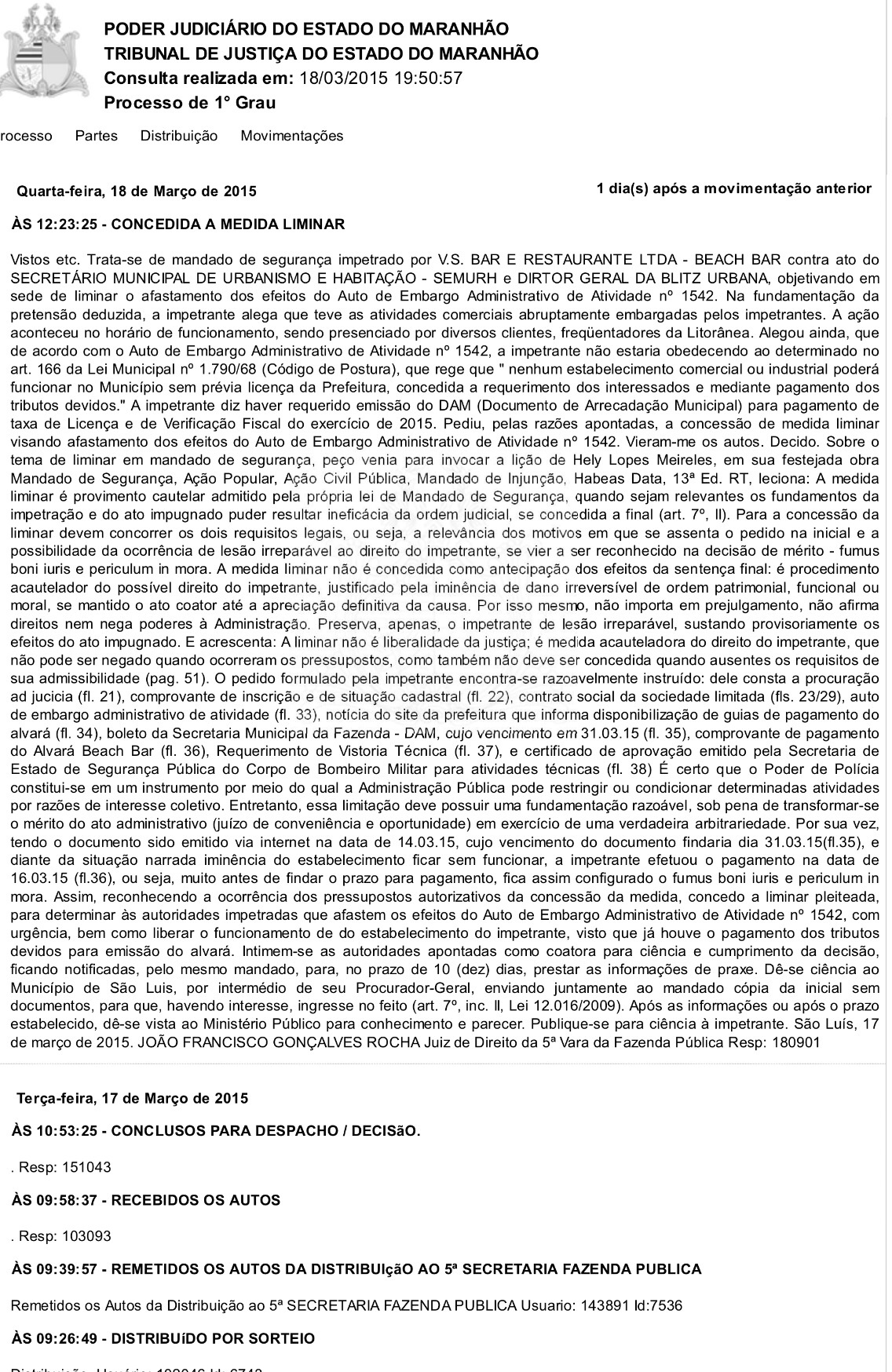 O juiz João Francisco Gonçalves Rocha, titular da 5ª Vara da Fazenda Pública autorizou a reabertura do V.S. Bar e Restaurante LTDA, o Beach Bar, na Avenida Litorânea. A decisão lavrada por meio de liminar reprovou o ato do secretário de Urbanismo e Habitação (SEMURH) e do diretor da Blitz Urbana, em determinarem o fechamento do estabelecimento. O promotor Cláudio Cabral esteve à frente da operação.