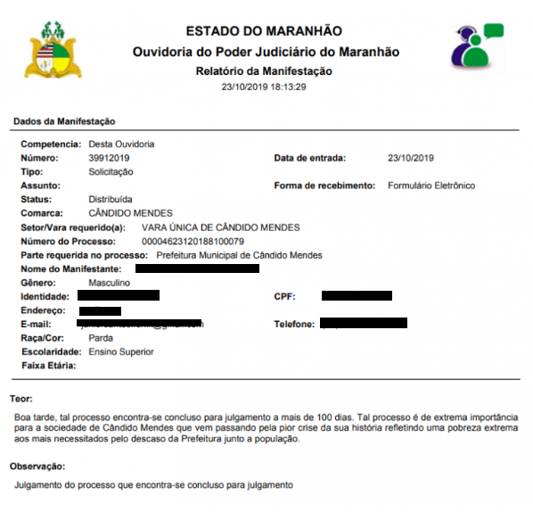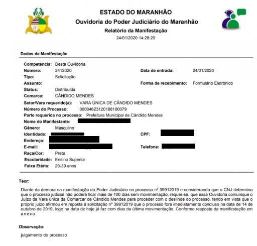 “Diante da demora na manifestação do Poder Judiciário no processo nº 39912019 e considerando que o CNJ determina que o processo judicial não poderá ficar mais de 100 dias sem movimentação, requer-se, que essa Ouvidoria comunique o Juízo da Vara única da Comarca de Cândido Mendes para proceder com o deslinde do processo, tendo em vista que o próprio juízo afirmou em reposta à solicitação nº 39912019 que o processo fora imediatamente concluso na data de 14 de outubro de 2019, logo na data de hoje já faz cem dias da última movimentação”, explicou a denúncia.