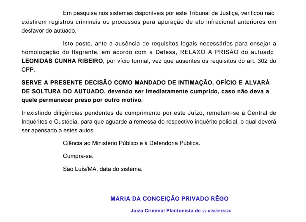 “Isto posto, ante a ausência de requisitos legais necessários para ensejar a homologação do flagrante, em acordo com a Defesa, RELAXO A PRISÃO do autuado LEONIDAS CUNHA RIBEIRO, por vício formal, vez que ausentes os requisitos do art. 302 do CPP”, decidiu.