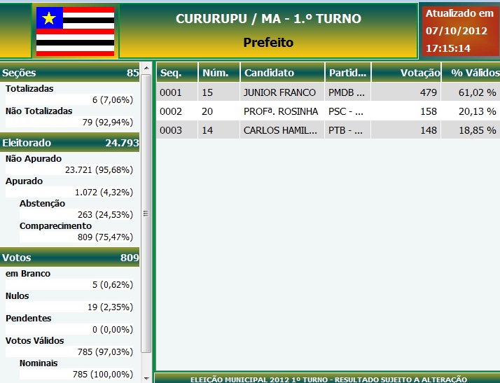Júnior Franco lidera em Cururupu; acompanhe as apurações aqui 07/10/2012 | PÁGINA PRINCIPAL, Notícias Navegação de Post Prefeito de Serrano do Maranhão é presoEdivaldo Holanda Júnior lidera em São Luís; veja
