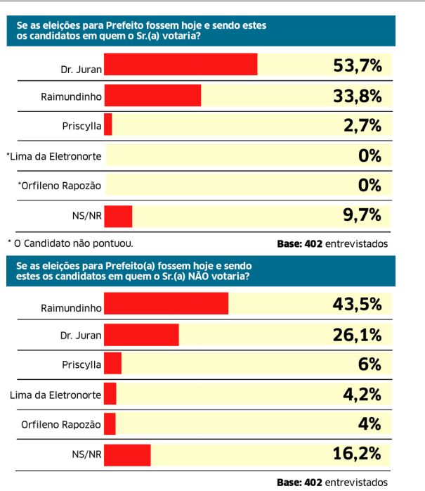 A pesquisa mediu também o índice de rejeição dos candidatos entre os eleitores. Nesse item, Raimundinho da Audiolar (PTB) aparece em 1º lugar. Entre os entrevistados, 43,5% disseram não votar nele de jeito nenhum. Juran Carvalho tem a segunda maior rejeição, 26,1%; Priscylla Sá fica com 6%; Lima da Eletronorte 4,2%, e Orfileno Rapozão vêm em seguida com 4% de rejeição.