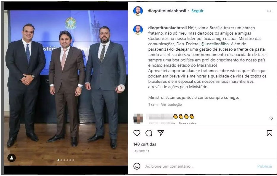 Quem acabou divulgando a reunião foi o empresário. Diogo Tito Salem Soares postou em suas redes sociais uma foto ao lado do ministro, que chamou de “nosso líder político” e “amigo”. Tito revelou ainda que no encontro tratou de “várias questões que podem em breve vir a melhorar a qualidade de vida de todos os brasileiros”, “através de ações pelo ministério.”
