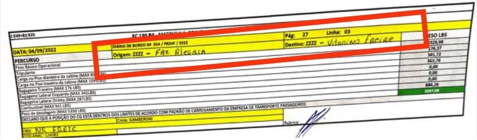 Os documentos sobre a contratação da Rotorfly Táxi Aéreo, que listam os nomes dos passageiros, foram enviados à Justiça Eleitoral pelo ministro em formulário fora do padrão, com rasuras e misturando informações digitadas e escritas a mão. Os planos de voo indicam registros de sobrevoo em que as cidades de origem e destino são as mesmas.