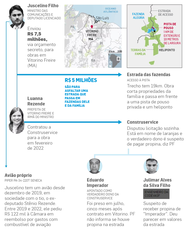 O ministro das Comunicações do governo Lula, Juscelino Filho, direcionou R$ 5 milhões do orçamento secreto para asfaltar uma estrada de terra que passa em frente à sua fazenda, em Vitorino Freire (MA). A propriedade também abriga uma pista de pouso para seu avião particular e um heliponto. Faltava uma boa estrada para levar à Fazenda Alegria.