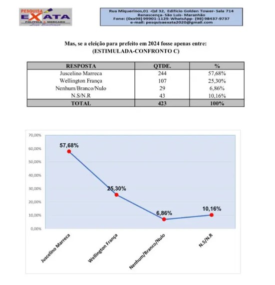 Na pesquisa da Exata, Juscelino Marreca aparece em primeiro lugar, com 57,68%. Em segundo lugar, aparece o sobrinho da atual Prefeita, Wellington França, com 25,30%, provável candidato a sua sucessão.