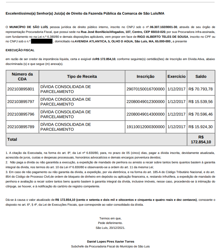Em janeiro de 2022, o prefeito foi notificado pela Justiça com um mandado de citação para pagar a dívida no prazo de cinco dias, porém não se manifestou sobre o caso.