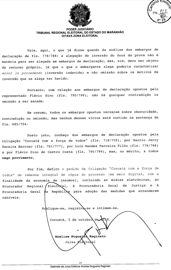 A magistrada não acolheu os embargos de declaração protocolados em agosto pelos comunistas e seus aliados. Todos foram condenados e declarados inelegíveis por 8 anos por abuso de poder nas eleições de 2016, quando Luis Filho venceu o pleito em Coroatá.