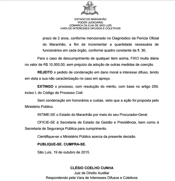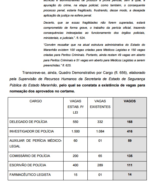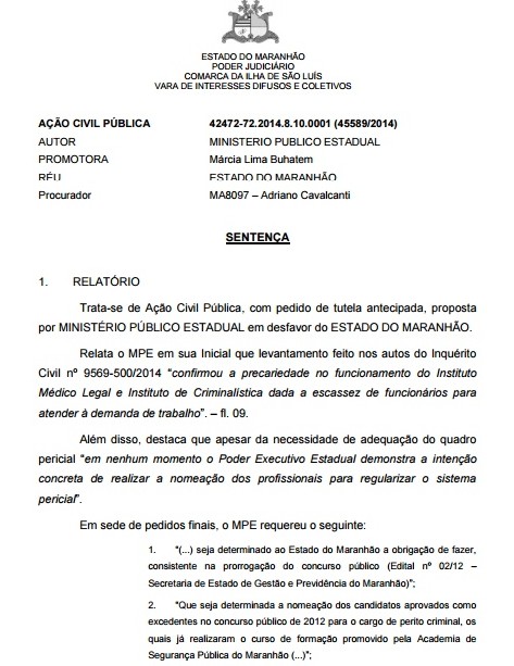 Escassez de funcionários – A sentença judicial atende à Ação Civil Pública com pedido de tutela antecipada proposta pelo Ministério Público Estadual em desfavor do Estado do Maranhão, em que o autor relata a precariedade no funcionamento do Instituto Médico Legal e Instituto de Criminalística devido à escassez de funcionários para atender à demanda de trabalho. De acordo com o autor da ação, “apesar da necessidade de adequação do quadro pericial em nenhum momento o Estado demonstra a intenção concreta de realizar a nomeação dos profissionais para regularizar o sistema pericial”.