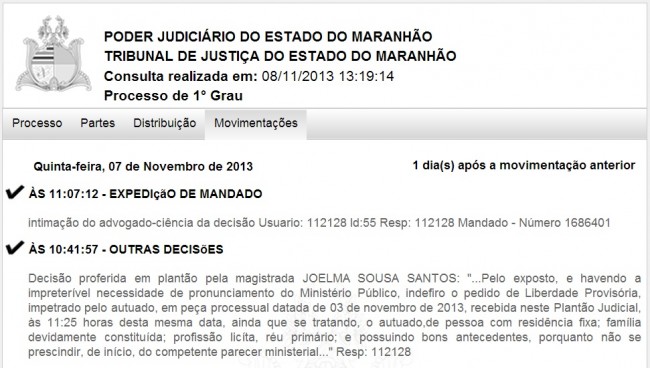 A decisão proferida em plantão pela juíza Joelma Sousa Santos diz que “havendo a impreterível necessidade de pronunciamento do Ministério Público, indefiro o pedido de Liberdade Provisória, impetrado pelo autuado”.