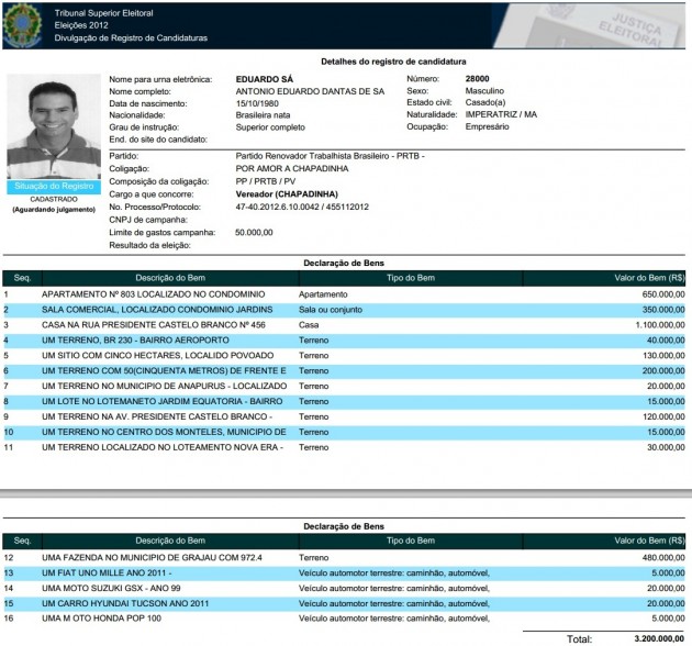 Em Chapadinha, rumores dao conta de que o vereador Eduardo Sá seria uma especie de testa de ferro do candidato a prefeito Magno Bacelar, o que explicaria a grande quantidade de bens em seu nome. Mais um motivo para que Magno tenha interesse em sua reeleição.
