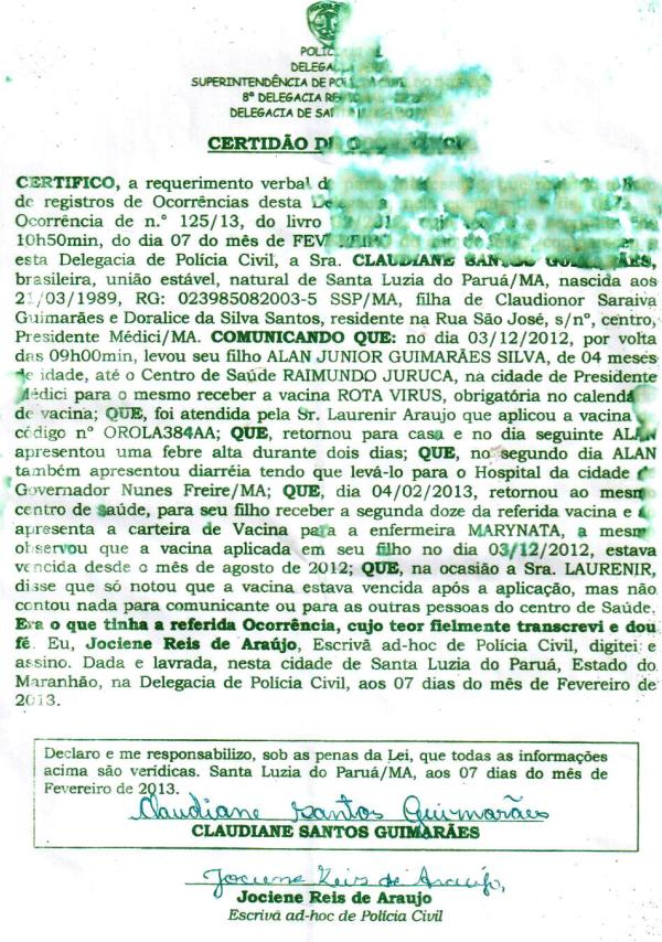 O Blog do Neto Ferreira divulga a ocorrência registrada por Claudiane Santos Guimarães contra o posto de Saúde do Município de Presidente Médici. Obviamente, é um resumo do fato já relatado pelo blog e titulado “Absurdo! Crianças tomam vacina vencida em Presidente Médici”. Confira abaixo: