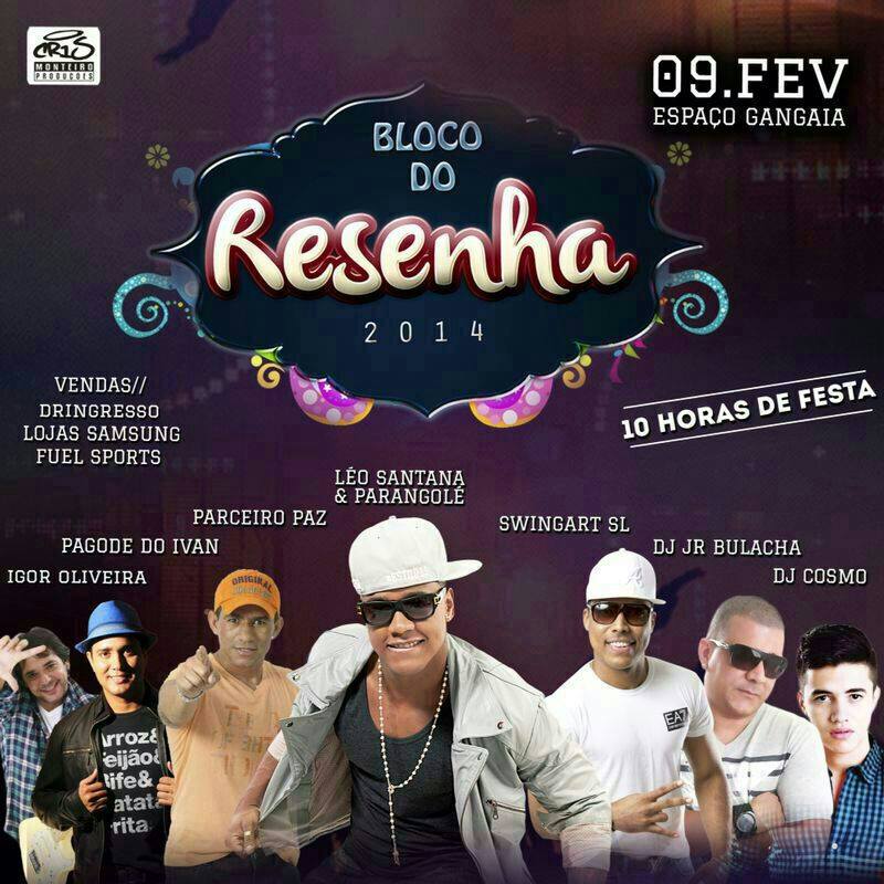 Vem ai o melhor pré-carnaval da ilha, Bloco do Resenha. São 10 horas de festa, é isso mesmo 10 horas de festa, dois dias, duas atrações que vão parar São Luís, Leo Santana, Parangolé e Thiago Brava e as melhores bandas locais.