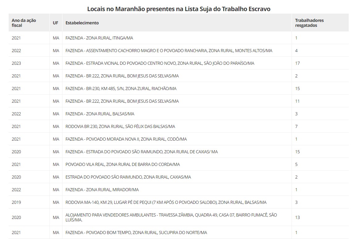 A chamada ‘Lista Suja do Trabalho Escravo’ acontece em abril e outubro de cada ano, pelo Ministério do Trabalho e Emprego (MTE). Em 2023, a última atualização aconteceu na última quinta-feira (5) e incluiu mais um empregador no Maranhão, especificamente em São João dos Patos. No total, foram 17 trabalhadores resgatados.
