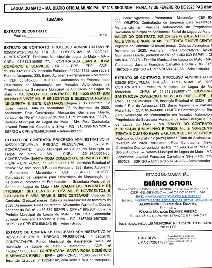 Entre 2016 e 2019, a empresa de Juvenal Francisco Carvalho e Silva abocanhou R$ 7,6 milhões em contratos nas Prefeituras de Buriti Bravo, Parnarama e de Lagoa do Mato. Os dados estão disponíveis no site do Tribunal de Contas do Estado.