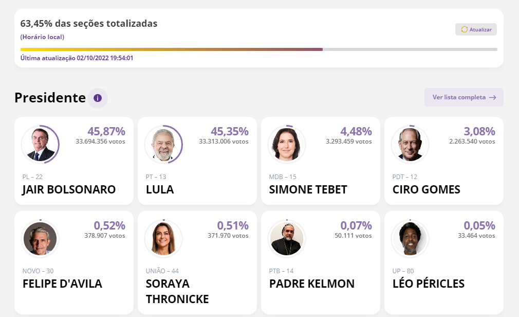 Lula empata com Bolsonaro 02/10/2022 | PÁGINA PRINCIPAL, Notícias Navegação de Post Com 60,3% das urnas apuradas, Lula se aproxima de Bolsonaro na disputaBrandão continua liderando no Maranhão