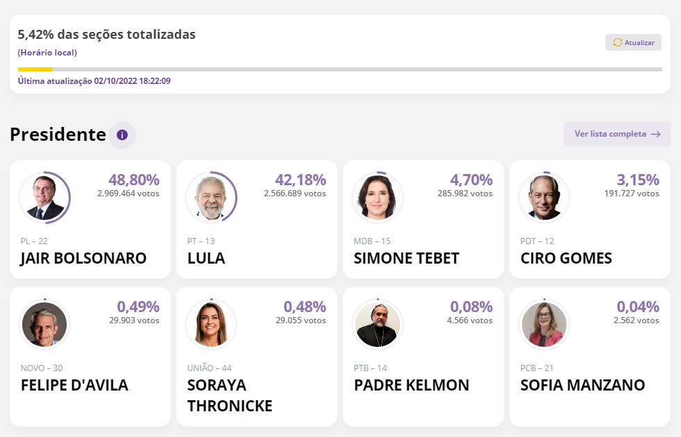 Lula já se aproxima de Bolsonaro na disputa presidencial 02/10/202202/10/2022 | PÁGINA PRINCIPAL, Notícias Navegação de Post Brandão lidera disputa para o governo do MaranhãoBrandão segue liderando corrida eleitoral com 54,13% no Maranhão