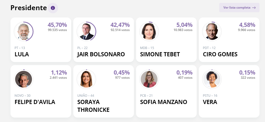 Lula na frente da disputa presidencial 02/10/202202/10/2022 | PÁGINA PRINCIPAL, Notícias Lula sai na frente da disputa presidencial com 45,70% dos votos. Navegação de Post Acompanhe ao vivo no Blog a apuração dos votosBolsonaro ultrapassa Lula na disputa