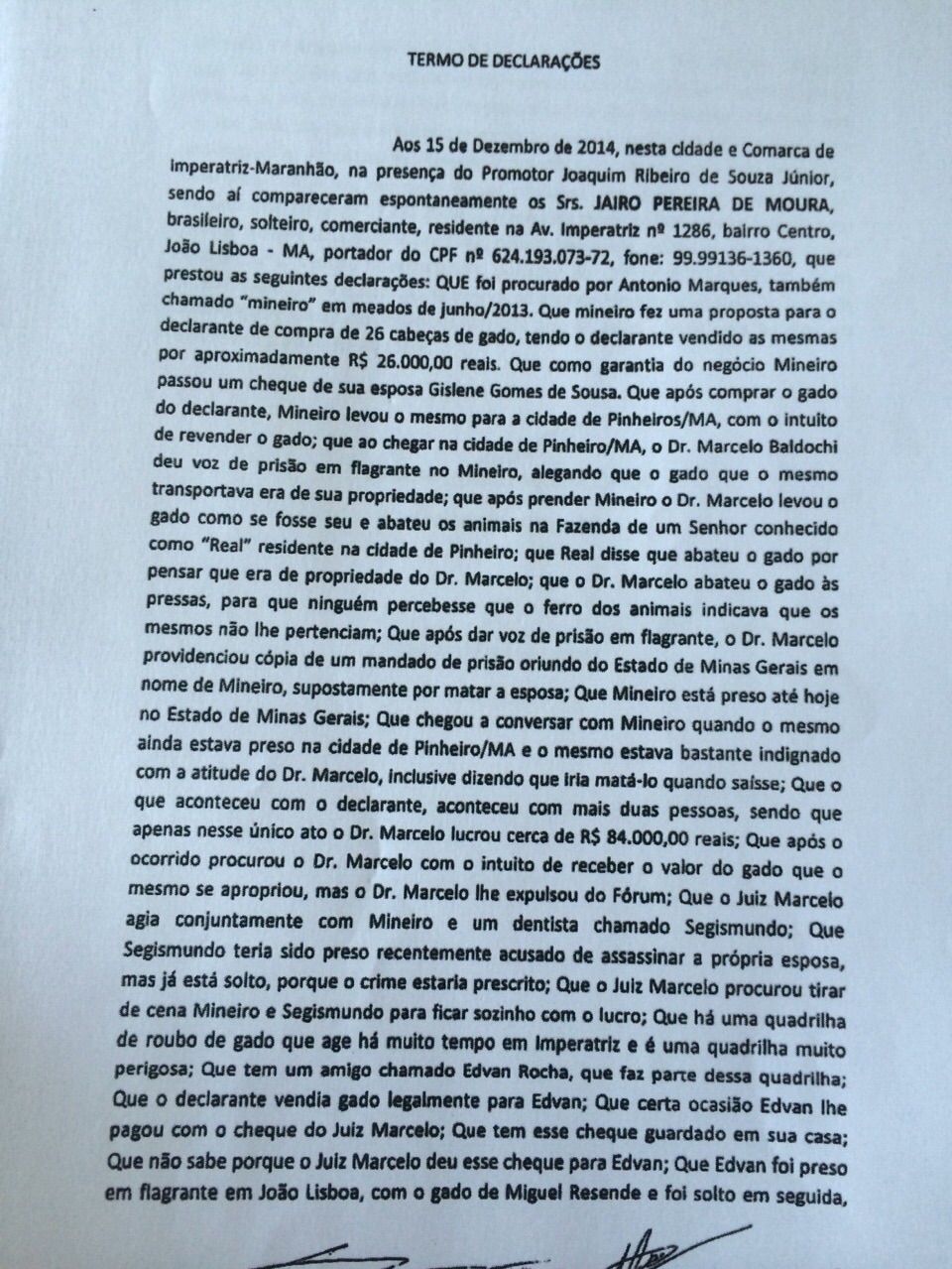 O declarante destaca que a quadrilha de roubo de gado é muito perigosa e que age há bastante tempo em Imperatriz. No depoimento consta também que o juiz Marcelo já fez o mesmo com mais duas pessoas, sendo que nesse único ato, o juiz lucrou cerca de R$ 84,000,00.