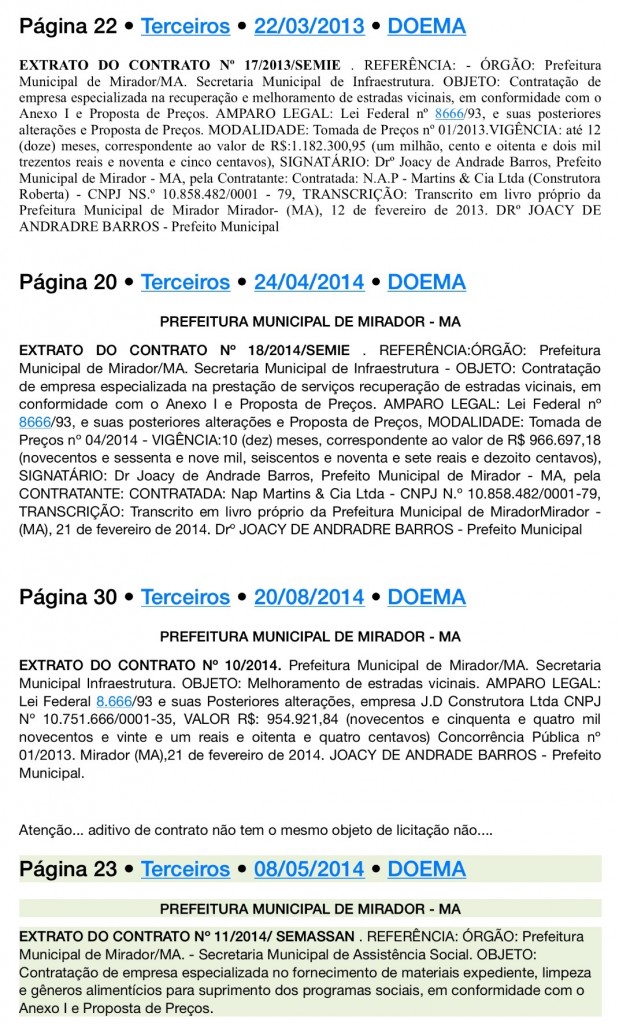 Um fato curioso é que, somente em 2014, as duas empresas N.A.P. Martins & Cia Ltda e J.D. Construtora Ltda aparecem como contratadas para o mesmo objeto de licitação. O contrato mais caro custou para os cofres públicos o valor de R$ 1.182.300,95.